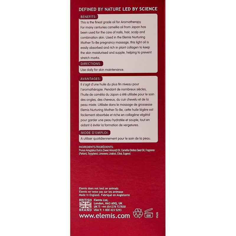 Elemis spa home Japanese camellia oil blend (100 ml) benefits improves elasticity perfect for pregnancy massages helps prevent stretch marks and the formation of scar tissue. Its used for the care of nails, hair, scalp and combination skin. Easily absorbed and rich in plant collagen. It is ideal for helping to prevent stretch marks while pregnant and improving skin elasticity and condition over the whole body. Ingredients:Prunus Amygdalus Dulcis (Sweet Almond) Oil, Camellia Oleifera Seed Oil, Fragrance (Parfum), Tocopherol, Limonene, Linalool, Citral, Eugenol