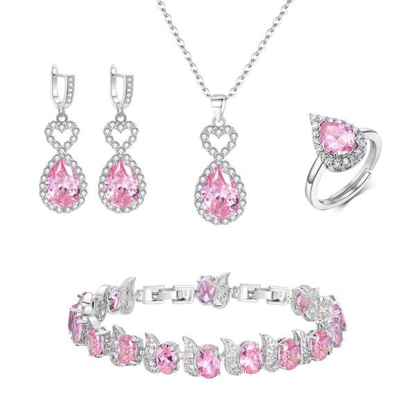 EleQueen Heart Necklace Earrings Bracelet Open Rings Set for Bride Bridesmaid, Cubic Zirconia Jewelry Set for Anniversary/Mother's Day/Memorial Day Pink Silver-Tone
