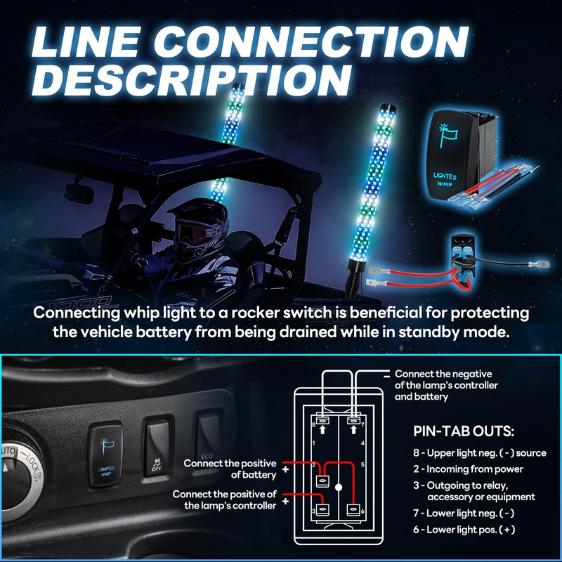 - 【Better Battery Protection and 6 Off-Road Flags】Equipped with rocker switch, no need to purchase separately. You can first connect the whip light to the rocker switch instead of directly connecting it to the battery to avoid running out of battery and easily operate the whip light from the cab. We have specially designed personalized flags for off-road enthusiasts, allowing you to stand out in off-road cycling.