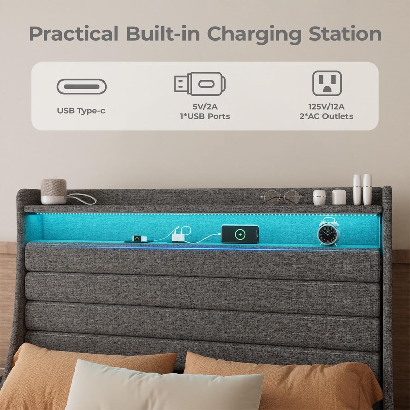 - Charge Up and Unwind: This upholstered platform bed frame comes with built-in USB ports for effortless charging of phones and tablets. Stay connected while you relax, ensuring your devices are powered for late-night browsing and morning alarms
