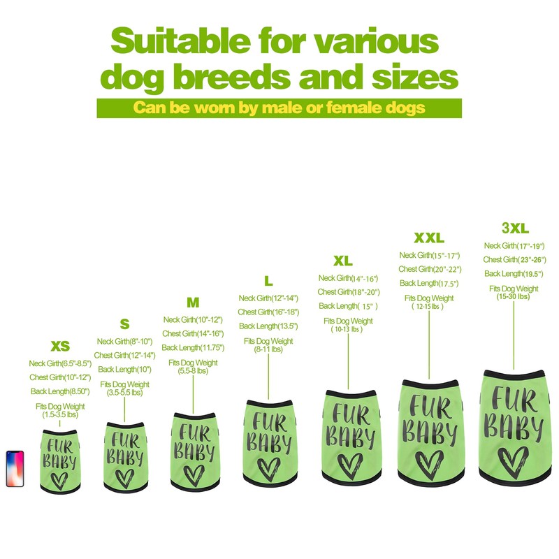 • Sizes: These shirts are available in different sizes to fit small to medium-sized dogs. Be sure to measure your dog's chest and neck girth before purchasing to ensure the best fit. The size chart can help guide you in choosing the right size for your pup.
