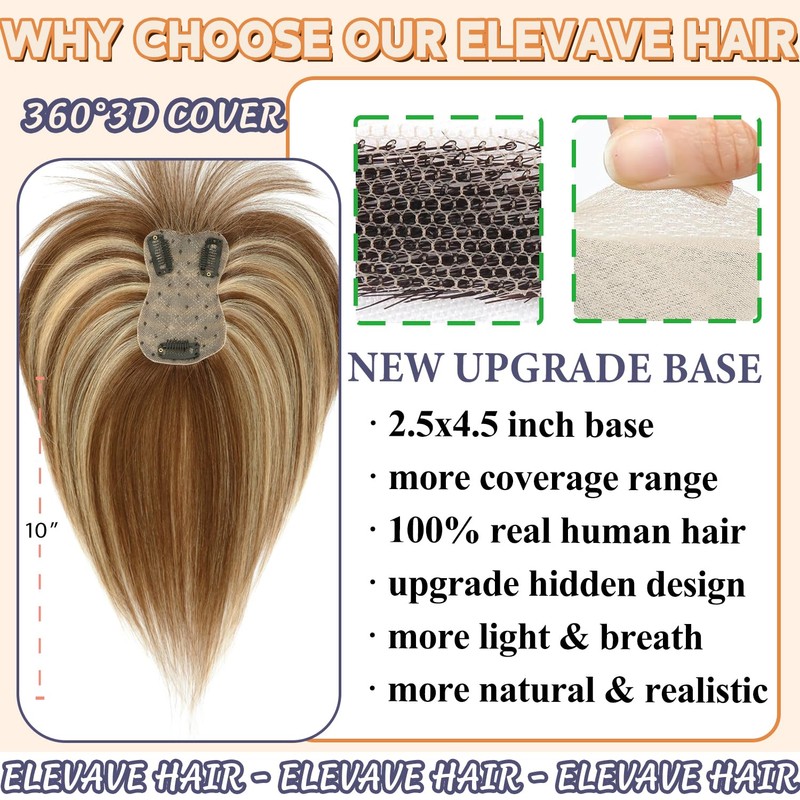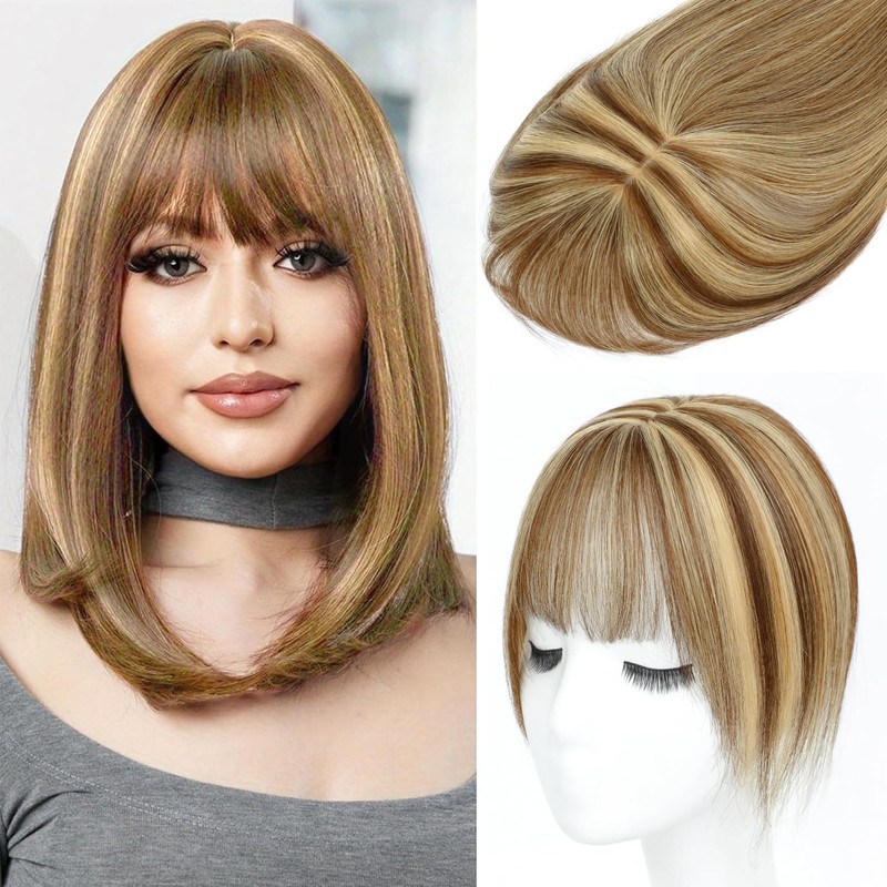 ELEVAVE Hair Toppers for Women Real Human Hair, 360°3D Cover Toppers Pieces for Women with Thinning Crown Wispy Clip in Bangs 10 Inch (P4/27)