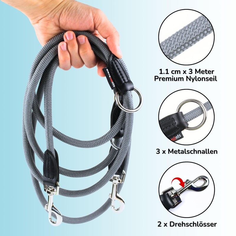 elevenants® Adjustable Dog Lead 3 Metres, Robust Nylon Shoulder Lead for Medium to Large Dogs, Lead with 200 kg Tensile Force, Double Lead with 2 Carabiners (Grey)