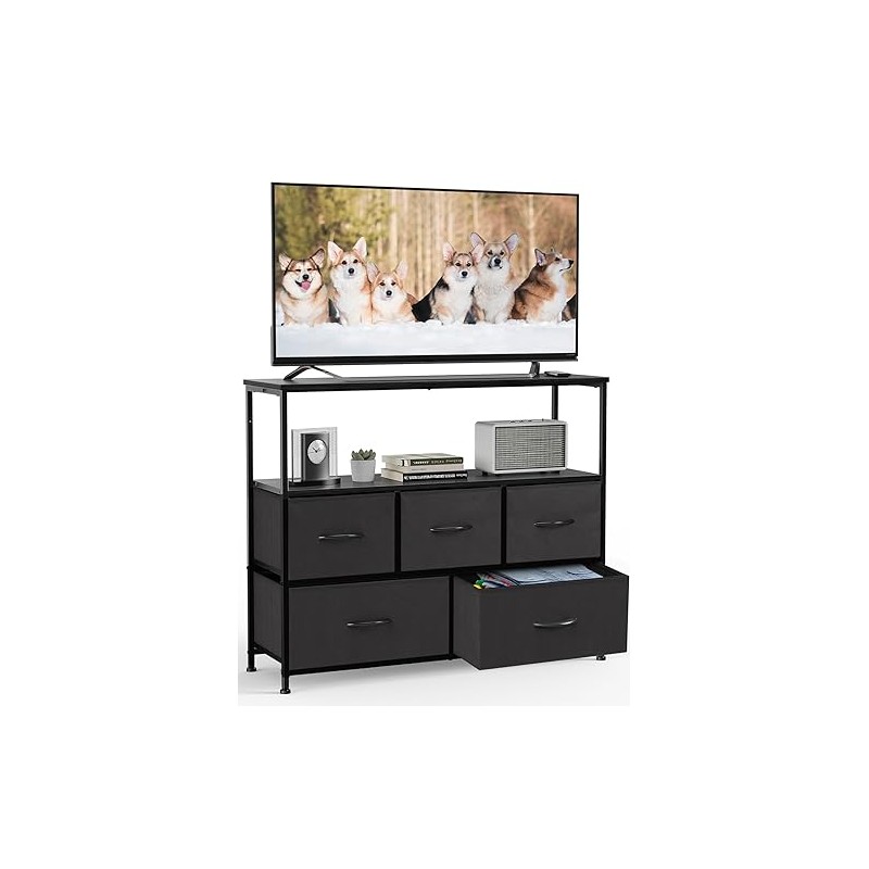 Elevon 5 Fabric Drawer Dresser TV Stand for Bedroom, Entertainment Center for 45 Inch TV with Storage Drawer Unit, Open Shelf, Adjustable Feet, Living Room