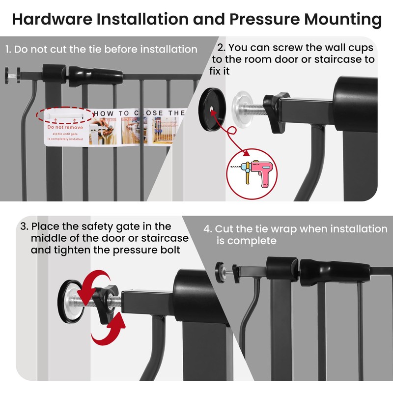 - Easy Installation: Simple pressure mounting takes approximately 15 minutes to install without assistance while protecting your walls. Notice: DO NOT cut off the zip tie on the gate before installation is completed, or the gate will completely broken and is unusable