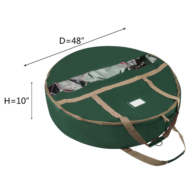 - HOLDS 48-INCH WREATHS- This durable tote is 48-inches in diameter and 10-inches deep and will have no problem holding fully decorated wreaths up to 48-inches wide. The clear panel on the front of the bag allows you to effortlessly see what is inside.