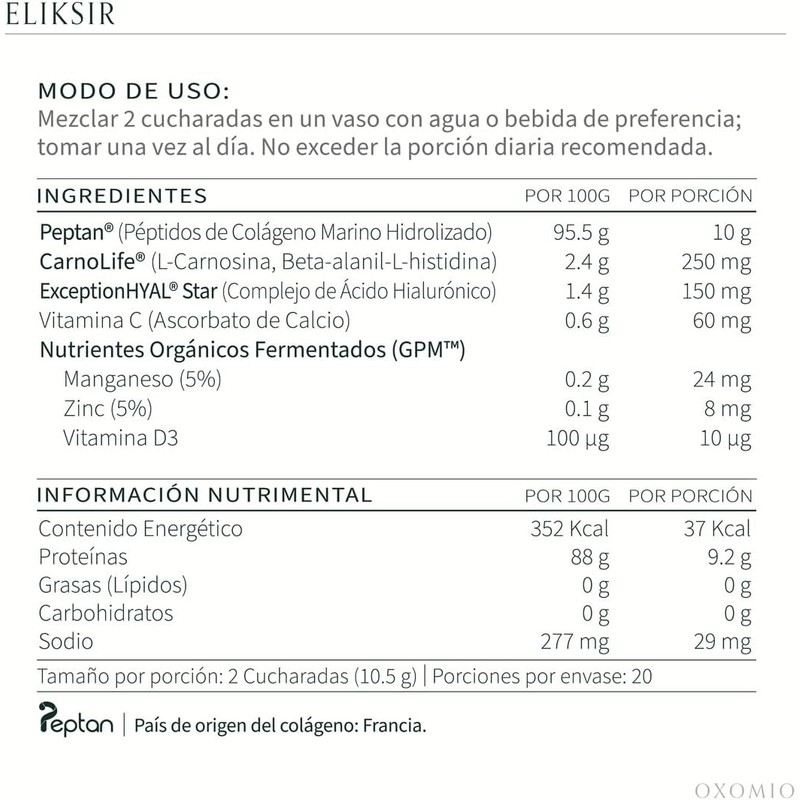 Descubre el poder de una belleza que nace desde adentro con Eliksir de OXOMIO, un exclusivo suplemento de colágeno marino hidrolizado tipo I, elaborado con Peptan® francés de alta pureza, científicamente reconocido por su biodisponibilidad y eficacia. Este elixir diario está diseñado para regenerar la piel a nivel celular, fortalecer tejidos conectivos, y apoyar tu bienestar integral con una fórmula limpia, funcional y sofisticada.