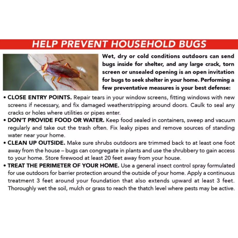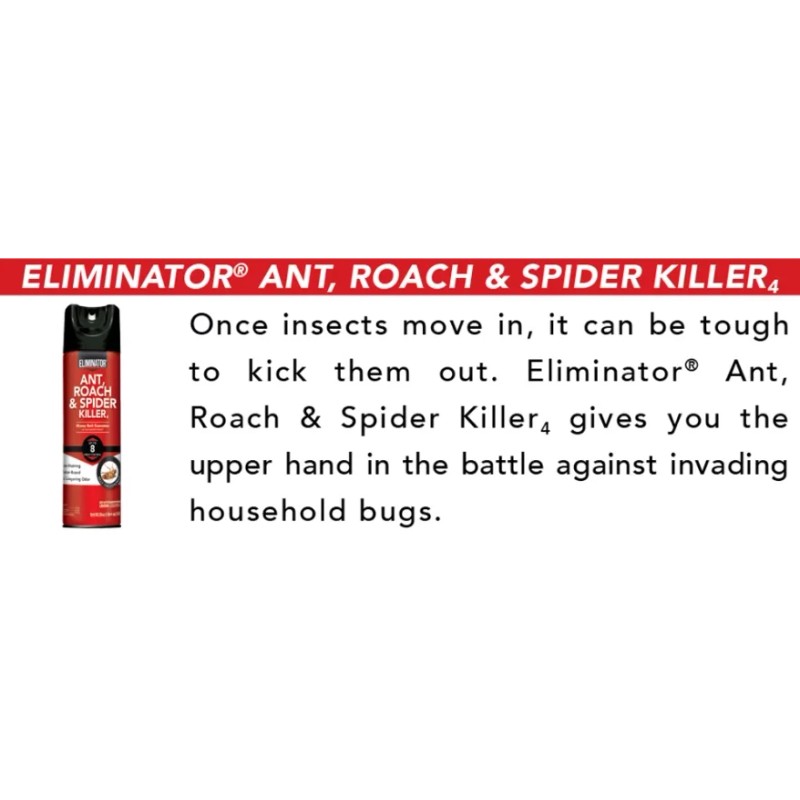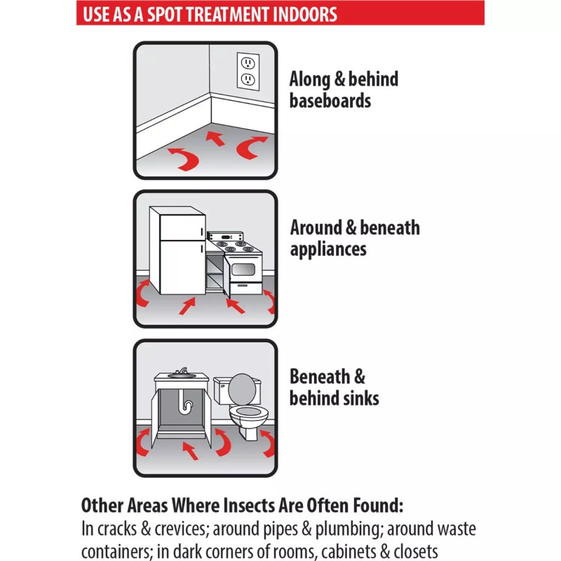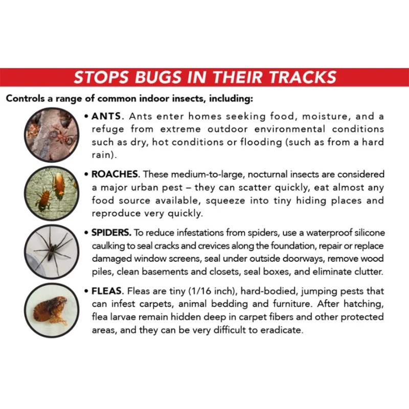 - Pest Type: Cockroach, Flea, Spider, cockroaches, ants, carpenter ants, crickets, firebrats, fleas, silverfish, spiders