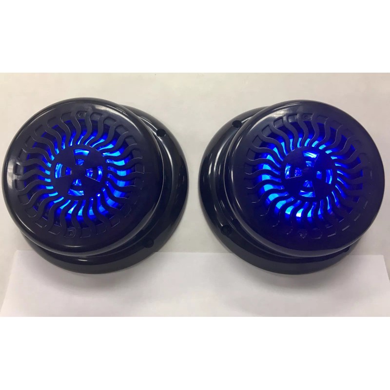 A PAIR of RV Marine Camper Glossy Black with Blue LED Showing 5 1/4" Flush Mount Speakers