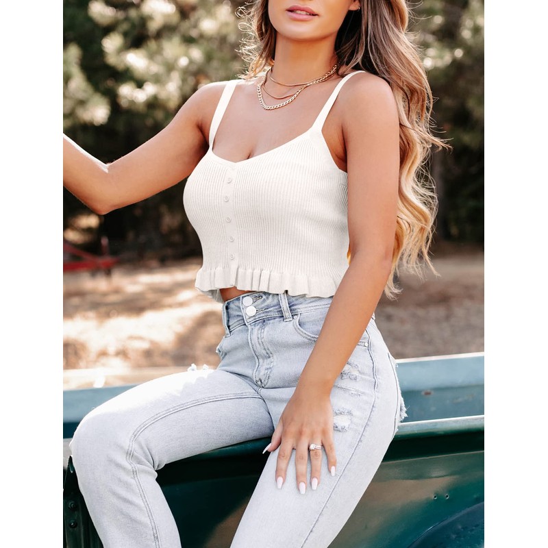 Elitechoice Women's Ribbed Knit Sleeveless Sweater Vest Button Detail Low Cut Ruffle Ruched Camisole White