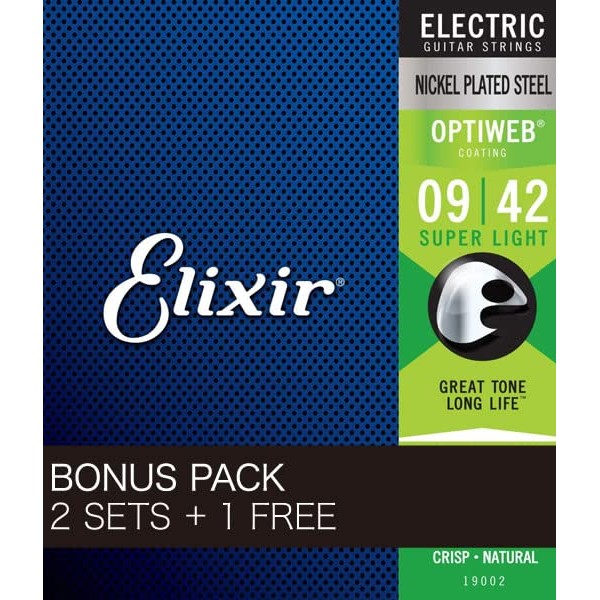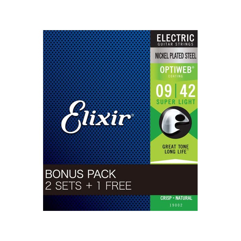 Elixir Electric Guitar Strings, 2 Sets + 1 Bonus Pack, OPTIWEB Super Light .009-.042#19002 BonusPack (2+1FREE)