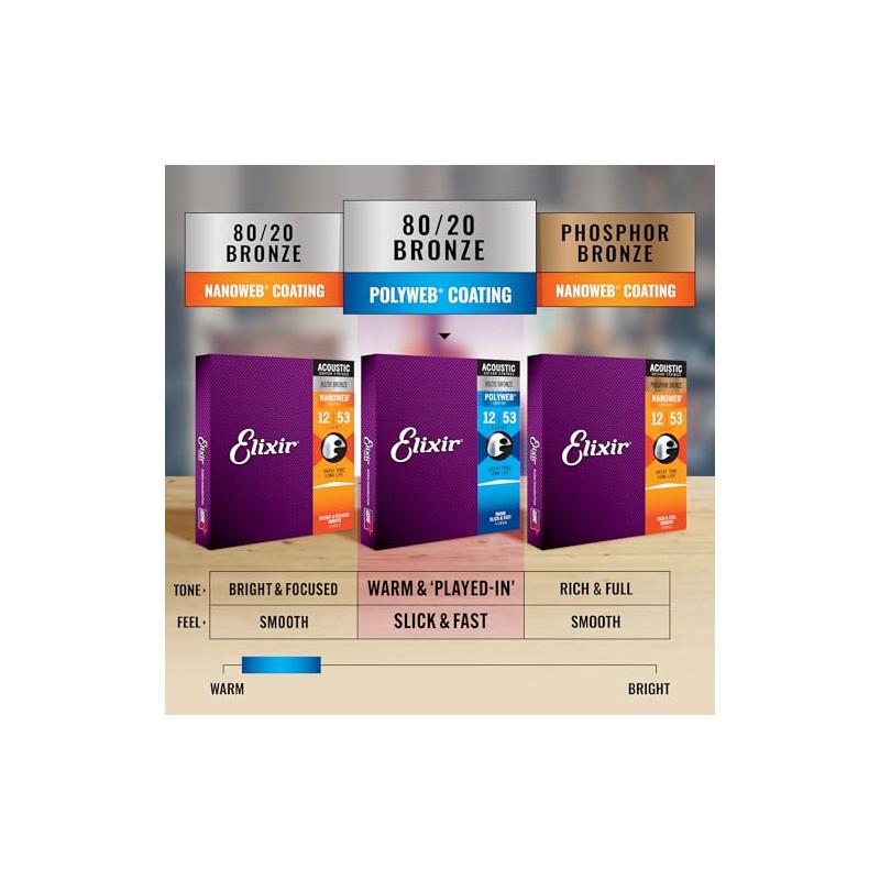 - CONTENTS: 1x Single Pack of Elixir Acoustic Guitar Strings, 80/20 Bronze with POLYWEB Coating, Longest-Lasting Warm Tone with Comfortable Feel, 12 String Set, Light 10/10-14/14-23/09-30/12-39/18-47/27