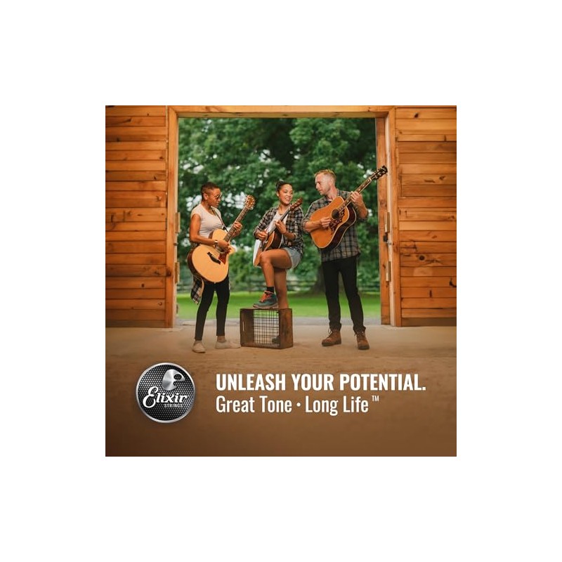 Jam on and on (and on) with the same premium acoustic guitar strings that experienced players worldwide trust to keep their incredible tone longer than any other string available. Unlike other string brands, Elixir Strings coats the whole string. This protects not only the outer string surface but also the gaps between the windings where common tone-deadening gunk typically builds up in other brands' coated and uncoated guitar strings. Anti-Rust Plating on plain steel strings ensures longer tone life for the entire set. Who wouldn't love more quality playing time between the hassle and cost of string changes? Crafted to last, these acoustic strings constructed with 80/20 (80% copper, 20% zinc) bronze wrap wire boast a warm, robust tone that sounds played-in right out of the pack while still retaining a remarkably clear mid-range presence. The POLYWEB Coating brings a soft, slick, and fast feel to the playing experience. For a more traditionally textured, uncoated feel, try our ultra-thin NANOWEB Coating. The 80/20 Bronze Acoustic Guitar Strings with NANOWEB Coating, for example, might be a good fit, especially if you're also looking for a crisper, brighter, and more vibrant tone. For strings that strike a dynamic balance between full-bodied tone and sparkling high-end clarity, our Phosphor Bronze Acoustic Guitar Strings deliver exactly that alongside our NANOWEB Coating's more traditional feel. Of course, the kind of string you play is all a matter of personal preference. Not sure what tone or feel is right for you? Try them out for yourself, and find your new favorite string from Elixir Strings. For a more in-depth look at what makes our strings so special, scroll to the branded info further down the page. Elixir Strings: Great tone. Long life.