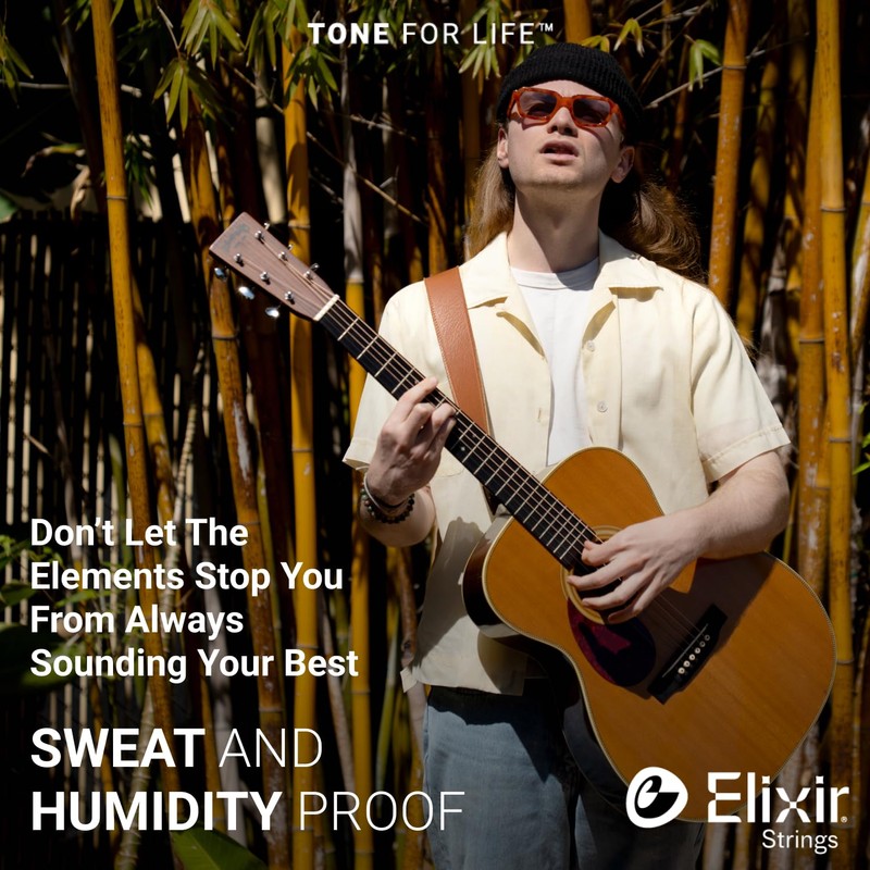 Strum confidently with the same premium acoustic guitar strings that experienced players worldwide trust to keep their incredible tone longer than any other string available. Unlike other string brands, Elixir Strings coats the whole string. This protects not only the outer string surface but also the gaps between the windings where common tone-deadening gunk typically builds up in other brands' coated and uncoated guitar strings. Anti-Rust Plating on plain steel strings ensures longer tone life for the entire set. Who wouldn't love more quality playing time between the hassle and cost of string changes? Engineered to endure, these acoustic strings constructed with phosphor bronze wrap wire boast a dynamic balance of rich, full-bodied tone and sparkling high-end clarity. Compared to our original POLYWEB Coating, the ultra-thin NANOWEB Coating allows a more traditionally textured, uncoated feel. For a slicker, gentler feel, try a set of strings with our original POLYWEB Coating. The 80/20 Bronze Acoustic Guitar Strings with POLYWEB Coating, for example, might be a good fit if you want a more robust and rounded tone. On the other end of the tone spectrum, our 80/20 Bronze Acoustic Guitar Strings with NANOWEB Coating deliver a brighter, crisper tone alongside the same traditional feel as these phosphor bronze strings. Of course, the kind of string you play is all a matter of personal preference. Not sure what tone or feel is right for you? Try them out for yourself, and find your new favorite string from Elixir Strings. For a more in-depth look at what makes our strings so special, scroll to the branded info further down the page. Elixir Strings: Great tone. Long life.