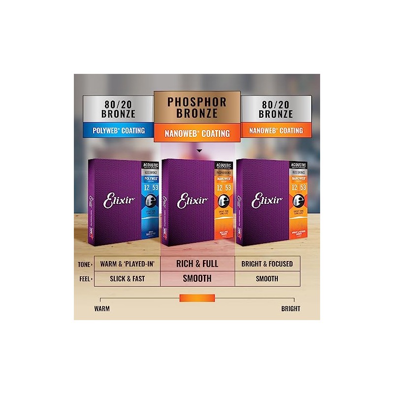 - CONTENTS: 1x Single Pack of Elixir Acoustic Guitar Strings, Phosphor Bronze with NANOWEB Coating, Longest-Lasting Rich and Full Tone with Comfortable Feel, 6 String Set, Light 12-16-24-32-42-53