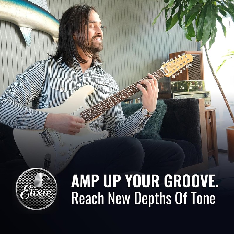 Elixir electric guitar strings with NANOWEB Coating deliver the presence, punch, and personality of traditional electric guitar strings but with extended tone life, consistent performance and greater playability. With less hassle and expense of frequent string changes, you enjoy more time making music. Elixir strings is the only brand to coat the entire string, protecting not only the outer string surface, but also the gaps between the windings. Elixir strings retain Their tone longer than any other string, uncoated or coated. The anti-rust plated plain steel strings also resists tone-deadening corrosion, ensuring longer life for the entire set.