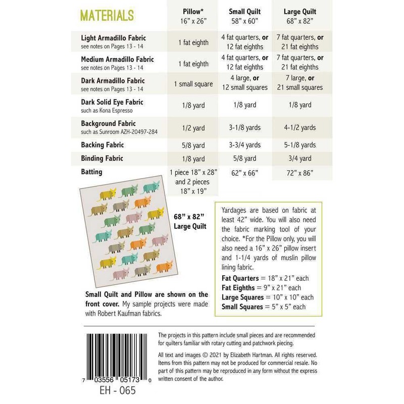 - No templates or paper piecing! Use your favorite fat quarters or fat eighths to make each armadillo your own