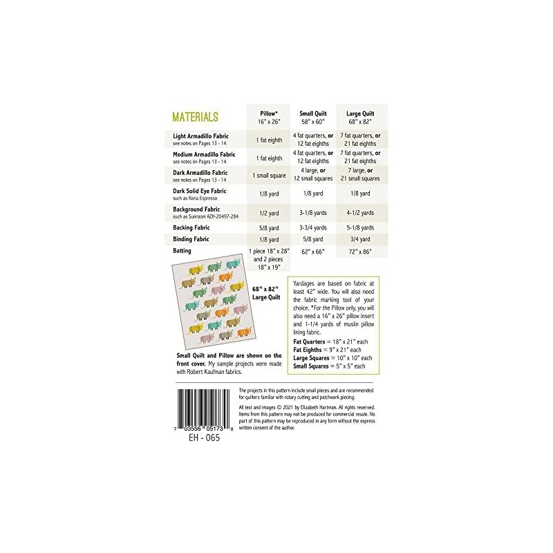- Pattern includes instructions for making a 16 in x 26 in Pillow, 58 in x 62 in Small Quilt, and 68 in x 82 in Large Quilt