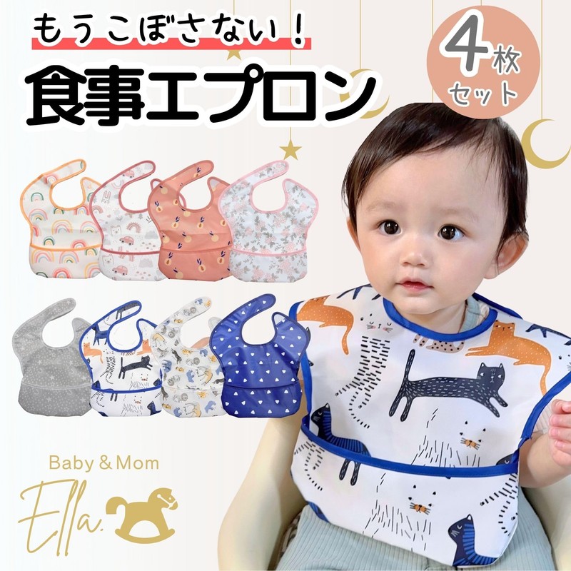 Ella Drying Friendly Meal Apron, Baby Apron, Baby Apron, 3D Pockets, Nursery School, Naming, Dirty Resistant, Easy to Wash and Dry Waterproof, Lightweight, Set of 4, Set of 4 A