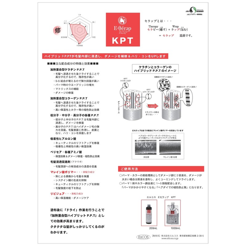 Hair repair agent used by hairdressers in the salon, power KPT is updated and renewed! 【E-Selap KPT 200ml】 Newly formulated maleate polymer. Multi-care from the inside of the hair Effective for repairing and preventing and moisturizing hair Improving moisturizing and excellent operation