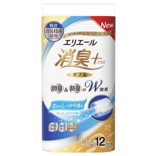 Elleair Deodorizing Plus (+), 82.8 ft (25 m) x 12 Rolls, Double, 100% Pulp, Fragrant, Fresh Clear Scent