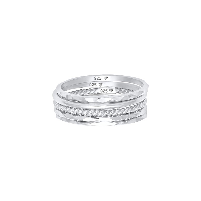 This trendy ring set, handmade from the finest 925 sterling silver, rounds off any outfit. The delicate look and unique design of these stacking rings is the perfect accessory for any occasion. The set consists of three textured, one twisted and one smooth finger ring, which invite you to combine according to your mood. Wear the jewellery stacked on one finger or spread over all fingers for a chic stacking look.