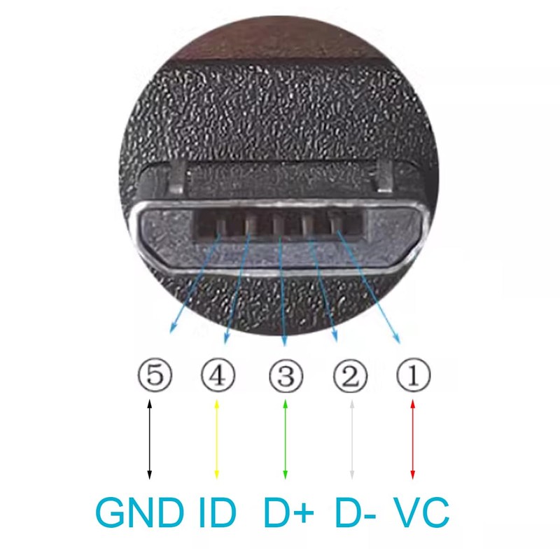 - Micro USB 5 Pin Cable :Please carefully read the product's image color and identification,Red wire for positve(28AWG), Black for ground(28AWG), Green for D+(30AWG), White for D-(30AWG),Yellow for CC1(30AWG),can be used for charging and data transfer