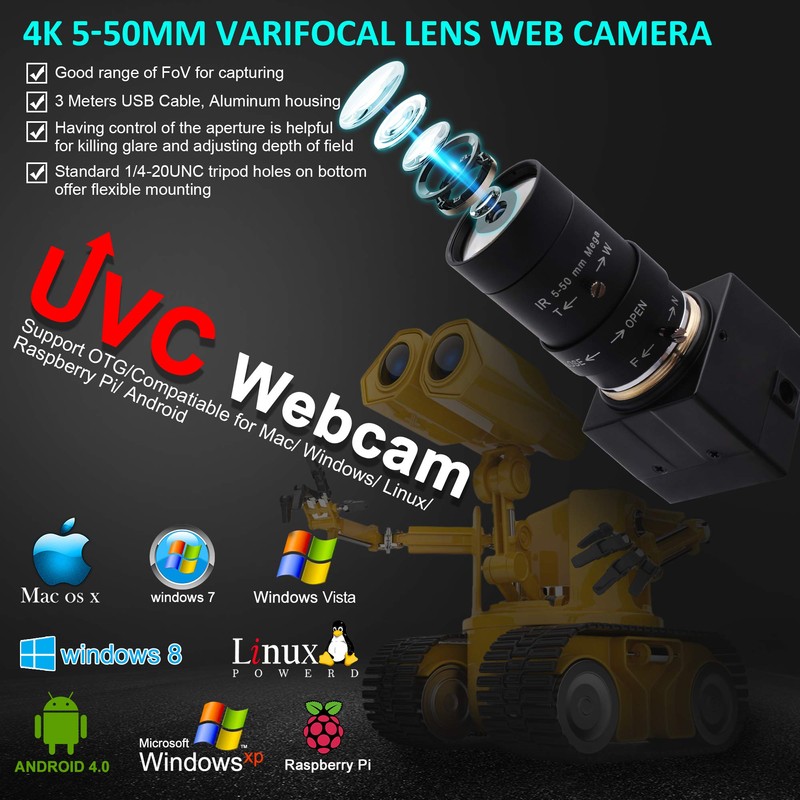 - 4K ultra HD webcam: ELP-USB4K03-SFV (5-50) 4K zoom webcam with HD 5-50 mm optical variable lens, IMX415 sensor PC mini webcam support 3840x2160@30fps, high-resolution web camera USB 2.0 plug and play for laptop, PC, desktop, 216. 0P USB Conference webcams for Mac/Windows/Linux/Android/Raspberry Pi, Ultra HD Web Cam USB for live streaming, video call, conference, online lessons. 4K webcam is the best choice for different applicable scenarios to output images or videos clearly