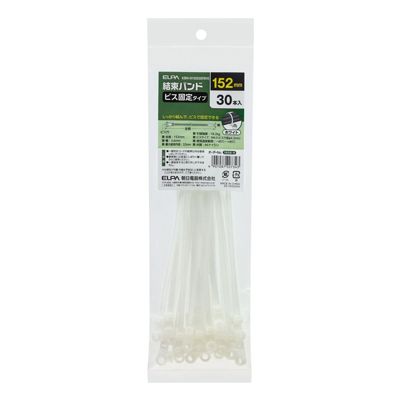 - ■Total length: 6.0 inches (152 mm). ■Width: 0.1 inches (3.6 mm). ■Maximum binding inner diameter: 1.3 inches (32 mm). ■Tensile strength: 38.2 lbs. (18.2 kg). ■Screw size: M4.0 (screw hole diameter φ4.3 mm). ■ Usable temperature range: -40 to +85 ℃ ℃ Material: 66 nylon. ■ nylon. ■