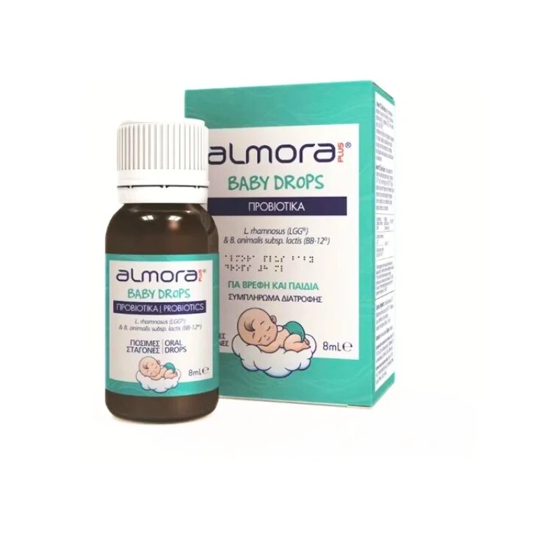 Almora Plus Baby Drops Probiotics is a drop supplement for babies and children containing the probiotic strains L.rhamnosus and B. animalis lactis.