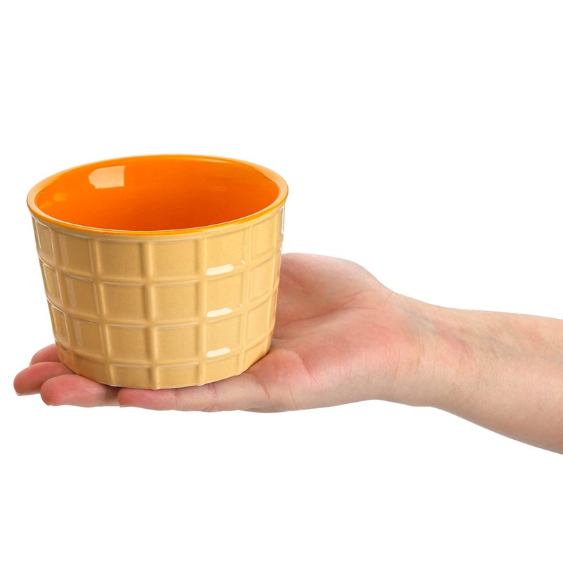 • Elsjoy 6 pack 9 oz ceramic ice cream cups come in 6 colors, orange/green/blue/red/yellow/pink, measure 4"D x 2.5"H. You can fit a large scoop of ice cream and add some toppings. Impress your guests with these cute cone cups!
