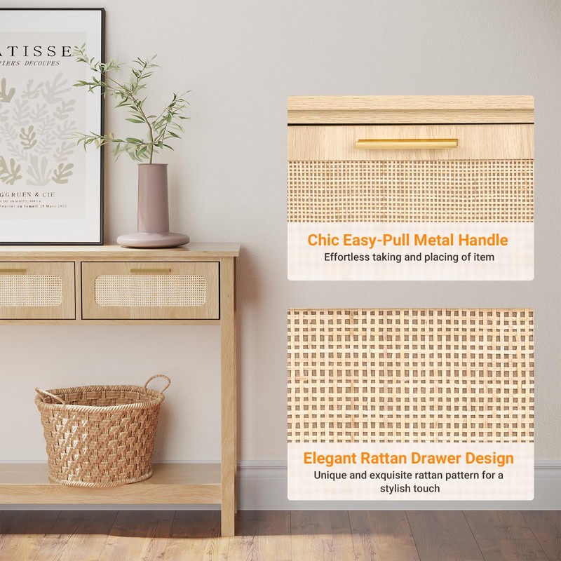 - Console Table with Rattan Accents: This boho console table is made of natural wood grain for a a crisp, smooth and textured texture. The drawer surfaces are finished in a woven rattan style, allowing you to enjoy the natural beauty of the piece. The classic design blends well with stylish, morden, rustic or farmhouse furniture decor styles to create a calm, natural atmosphere in your home
