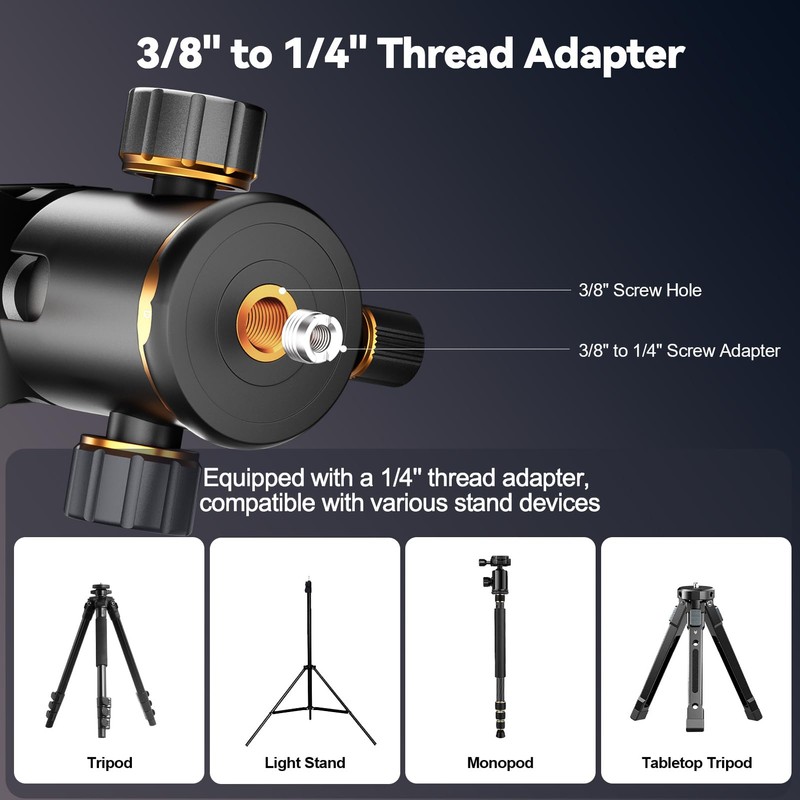 - 【Wide Compatibility】This ballhead is equipped with a 1/4-inch Arca-compatible quick-release plate, compatible with major digital SLR brands (Sony, Canon, Nikon). The 3/8-inch threaded base features a 1/4"-3/8" screw adapter for versatile mounting on tripods, light stands, and monopods