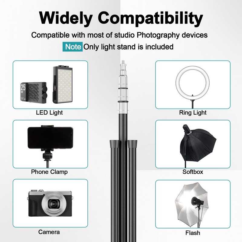 • Adjustable Height for Any Scene: From Desk to Dynamic Shots;Extend from 2.8ft (86cm) for close-up product photos to 8.5ft (260cm) for full-body TikTok dances or overhead salon lighting. The boom arm-ready design tackles large backdrops and professional studio work without bulky equipment