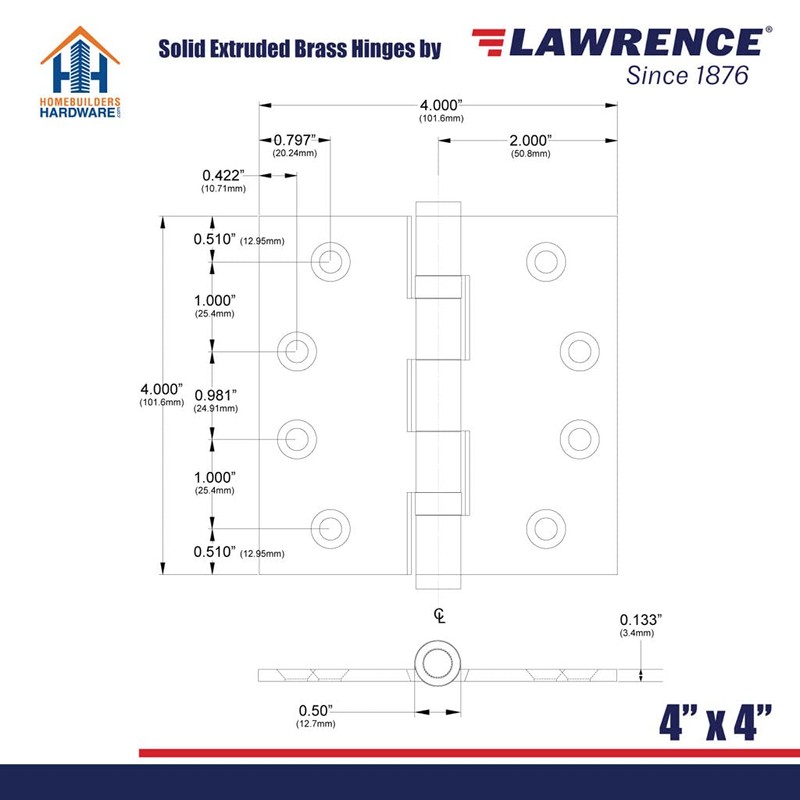 - Solid Brass - Upgrade cheap and flimsy door hardware with the hefty durability of solid brass. These 4 x 4 inch hinges are 3.4mm and engineered for long-lasting resilience and weatherproof corrosion resistance. Your best choice for exteriors.