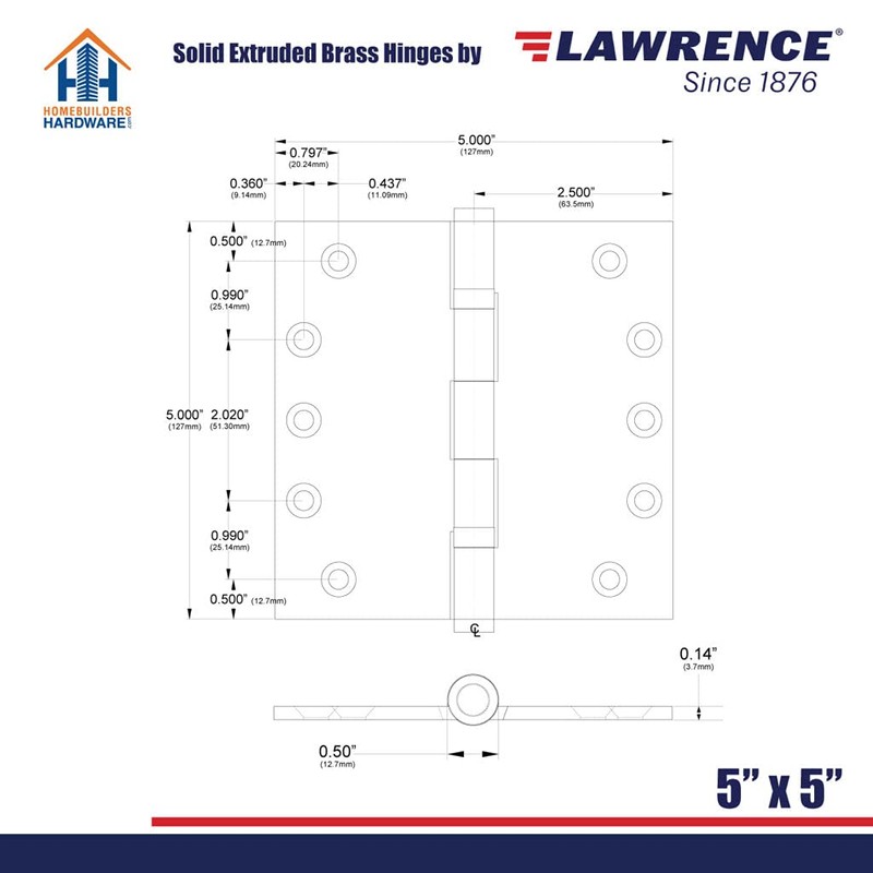 - Solid Brass - Upgrade cheap and flimsy door hardware with the hefty durability of solid brass. These 5 x 5 inch hinges are 3.7mm and engineered for long-lasting resilience and weatherproof corrosion resistance. Your best choice for exteriors.