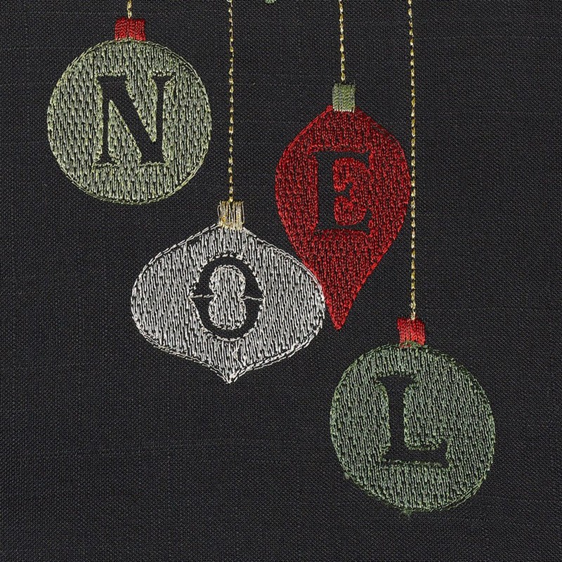 - This festive Noel table runner is a charcoal colour with an embroidered baubles and mistletoe design and would make the perfect finishing touch for your dining room table during Christmas time.