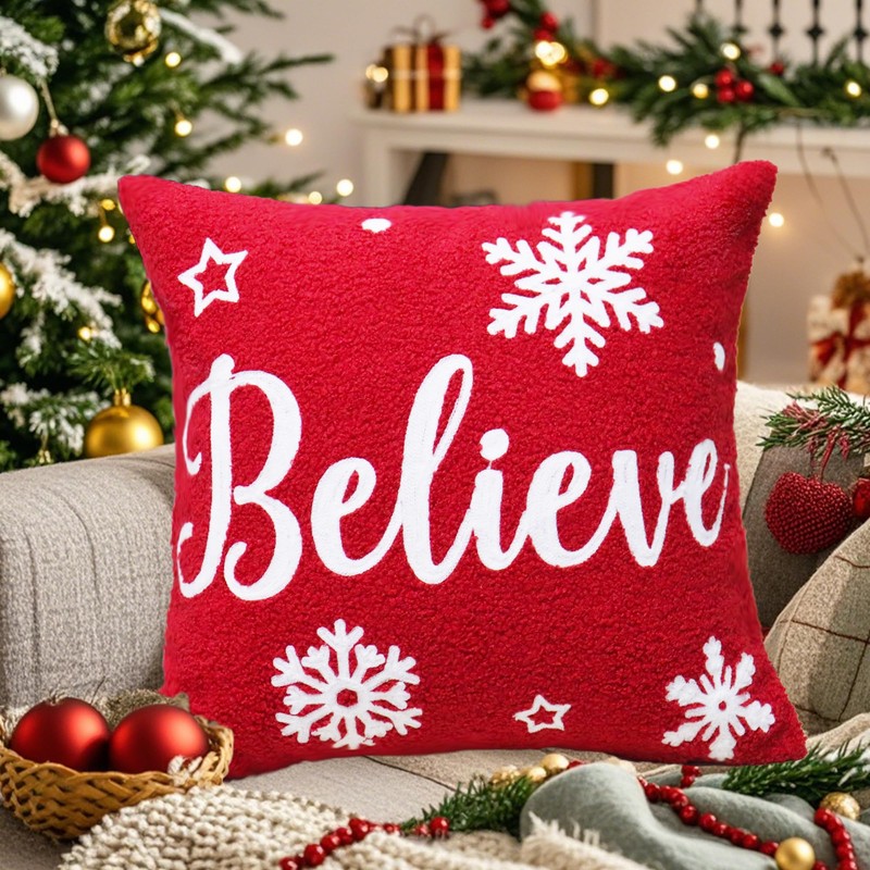 Embroidered christmas pillow covers,Christmas Pillow Covers 18x18 inch Christmas Decoration Red Believe Soft Plush Faux Fur Jacquard Throw Pillows for Bedroom Sofa Holiday Festivals Winter Home Decor