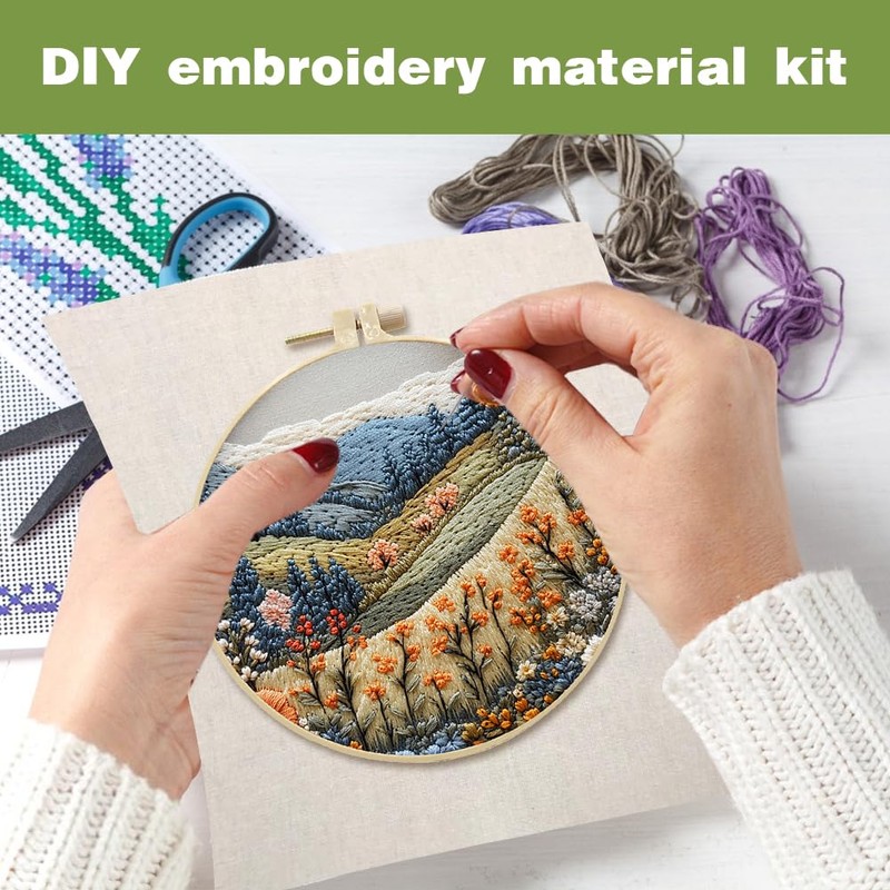 - Mountain Scenery Pattern: This DIY embroidery kit for beginner adopts some patterns about natural landscapes, which are creative and clear. The diverse mountain scenery, trees, flowers, or rivers make the entire embroidery work as beautiful as a painting.