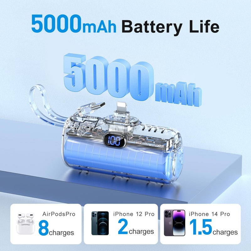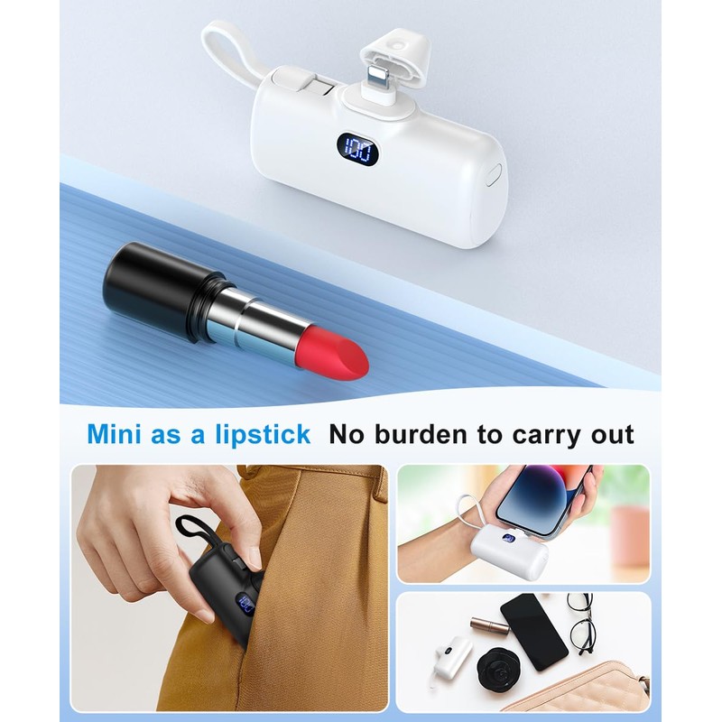 EMEHIO EMEHIO Portable Charger, Mini Power Bank, 5000mAh Phone Charger, Compact Battery Pack for iPhone & Android, USB C Cable, LCD Display, Battery Bank Compatible for iPhone 14/13/12/11/XS/X/8/7/6/5