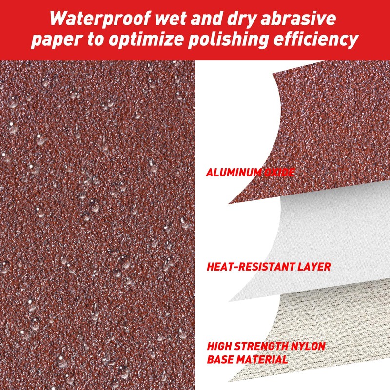 - Durability: Aluminum oxide abrasive bonded to tear-proof nylon backing withstands wet/dry sanding without fraying