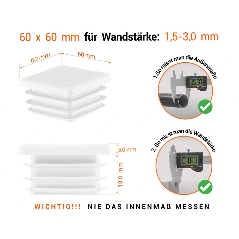 - Dimensions and colours: square plugs with dimensions 60 x 60 mm, wall thickness from 1.5 to 3.0 mm, colour white (RAL 9010), pieces per pack: 10. Other measurements are shown in the picture and in the table.
