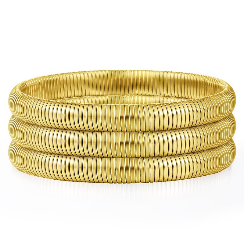 Emibele Gold Bangle Bracelet Set 3Pcs, 8mm Chunky Stainless Steel Non Tarnish 18K Gold Plated Bracelet Stack, Flexible Stretch Wide Wristband Bangle Layered Snake Chain Bracelet for Women