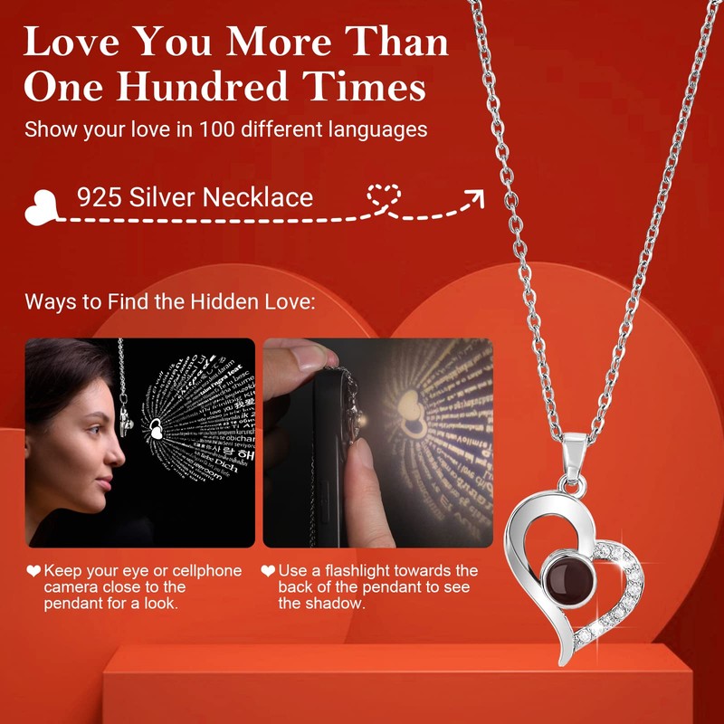 - đčă100 Languages I Love You Necklaceă The elegant heart shape necklace is made of S925 sterling silver with fancy crystal pendant. This love necklace used special engraving technology to engrave "I Love You" in 100 different languages into the love crystal stone. Bring the stone in the middle of the necklace close to your eyes or to your phone's rear camera and then you can catch words.