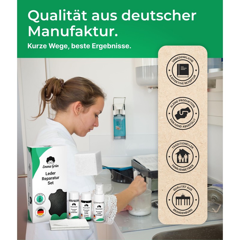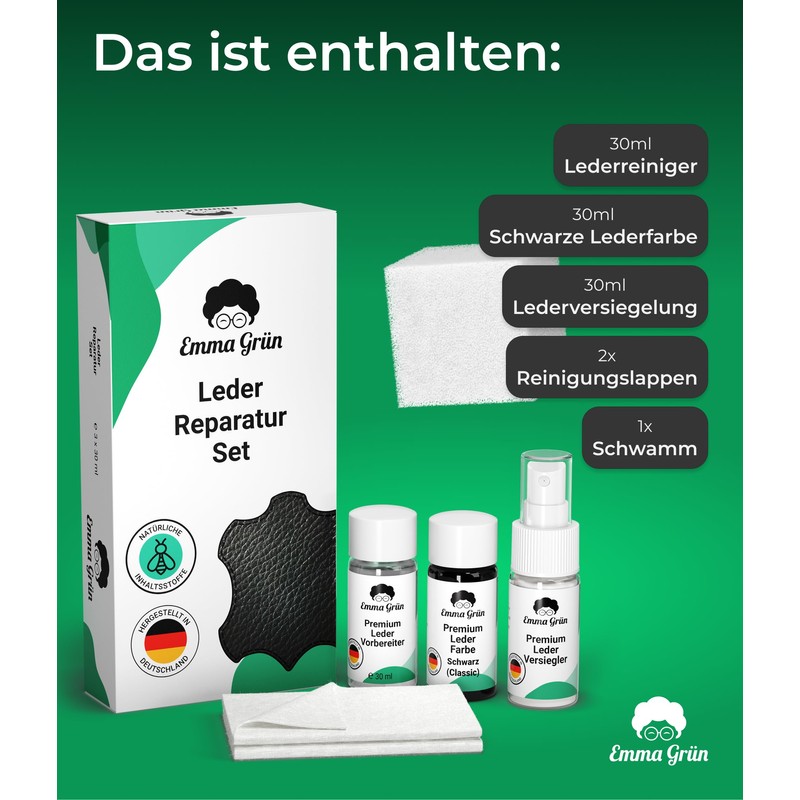 - Qualität aus Deutschland auch für Kunstleder: Emma Grün steht für Lederreparatur wie zu Omas Zeiten. Wir entwickeln, produzieren und verpacken dieses Produkt in einer kleinen Manufaktur in Deutschland. Dabei ist uns Transparenz wichtig: Der Vorbereiter/Lederreiniger muss gerade am Lenkrad alle Verschmutzungen zuverlässig lösen. Daher kann es sein, dass dieser etwas intensiver riecht. Natürlich wirksam. Natürlich Emma.