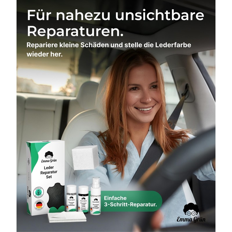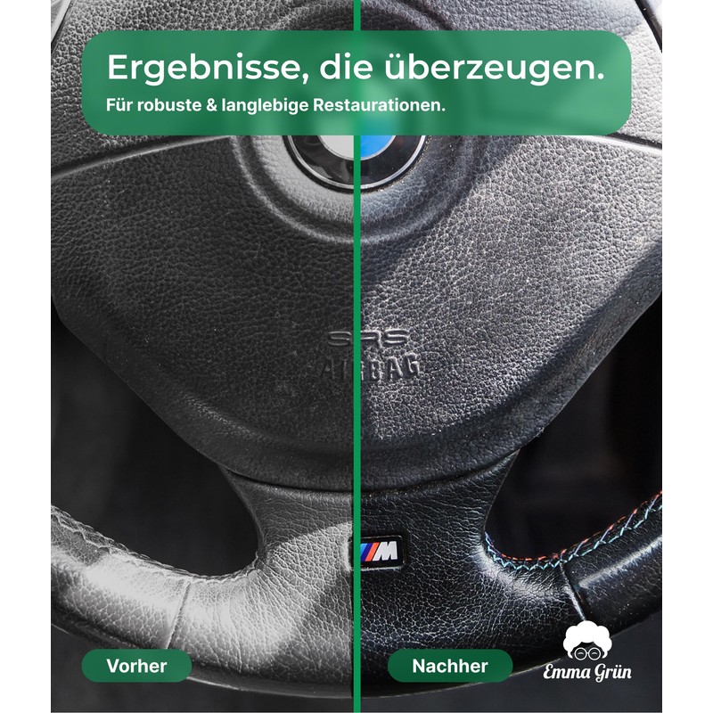 - Für nahezu unsichtbare Lederaufbereitung: Das Emma Grün Lenkrad-Reparaturset für schwarzes Leder sorgt für einen neuen, matten Lack dort, wo er am meisten benötigt wird. Lenkräder sind anfällig für Verschleiß und Farbverlust im Innenraum eines Autos. Ständiger Hautkontakt führt zu Schmutz und Fett im Leder, Sonnenlicht verblasst die Farbe, und häufige Nutzung verursacht Kratzer und Schäden.