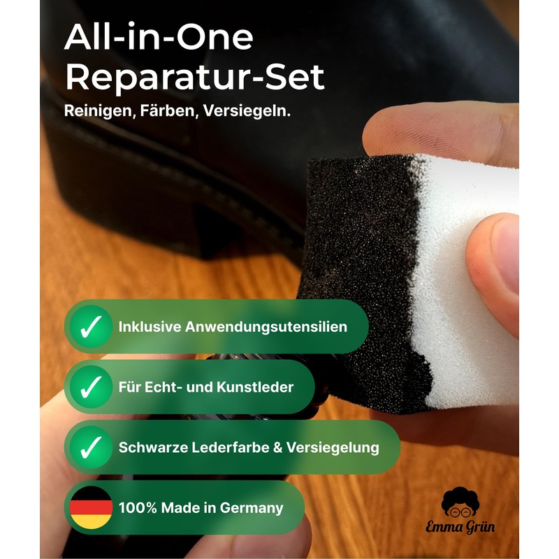 Emma Grün® Lederreparaturset Schwarz [KOMPLETT SET] - Professionelles Leder Reparatur Set für Sofas, Möbel, Lenkräder & Autositze - Ideal für DIY Leather Repair Kit Anwendungen - Made in Germany