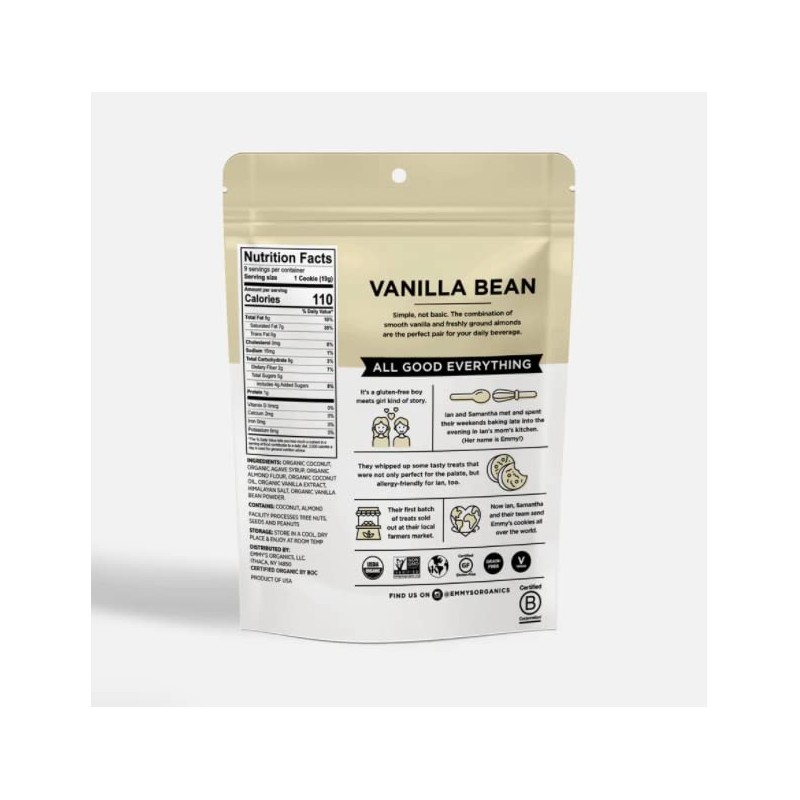- Emmy's Organics Coconut Cookies are crafted in small batches, using organic ingredients like extra-virgin coconut oil, almond flour and Himalayan salt; this is guilt-free snack food heaven - moist, chewy goodness in every bite