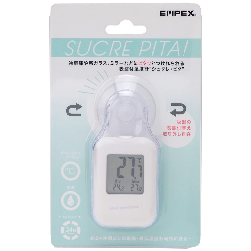 - Features: Thermometer (maximum and minimum temperature display every 24 hours), splash-proof, suction cup, can be hung or hung (if the suction cup is removed)
