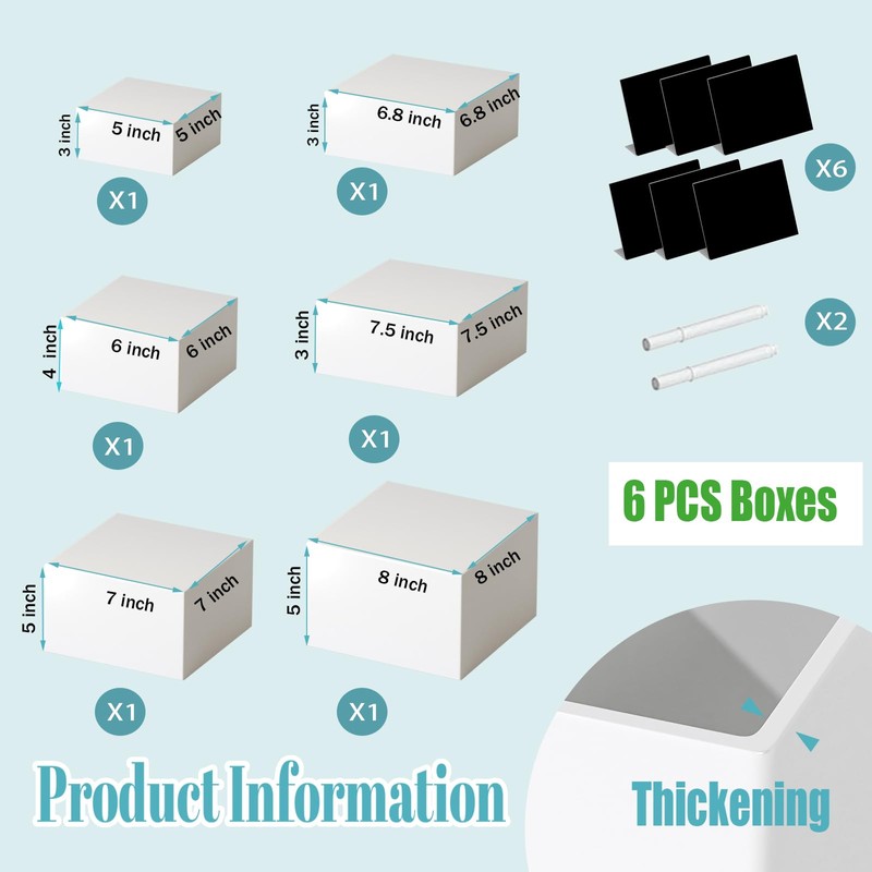 - Buffet Risers Set of 6 Nesting Acrylic Boxes: This buffet risers set includes 6 different sizes: 8 x 8 x 6 inch, 7 x 7 x 5 inch, 6 x 6 x 4 inch, 7.5 x 7.5 x 3 inch, 6.8 x 6.8 x 3 inch,5 x 5 x 3 inch, Includes 6 x display cards (4x2.5") and 2 dry erase markers for elegant labeling at galas/storefronts